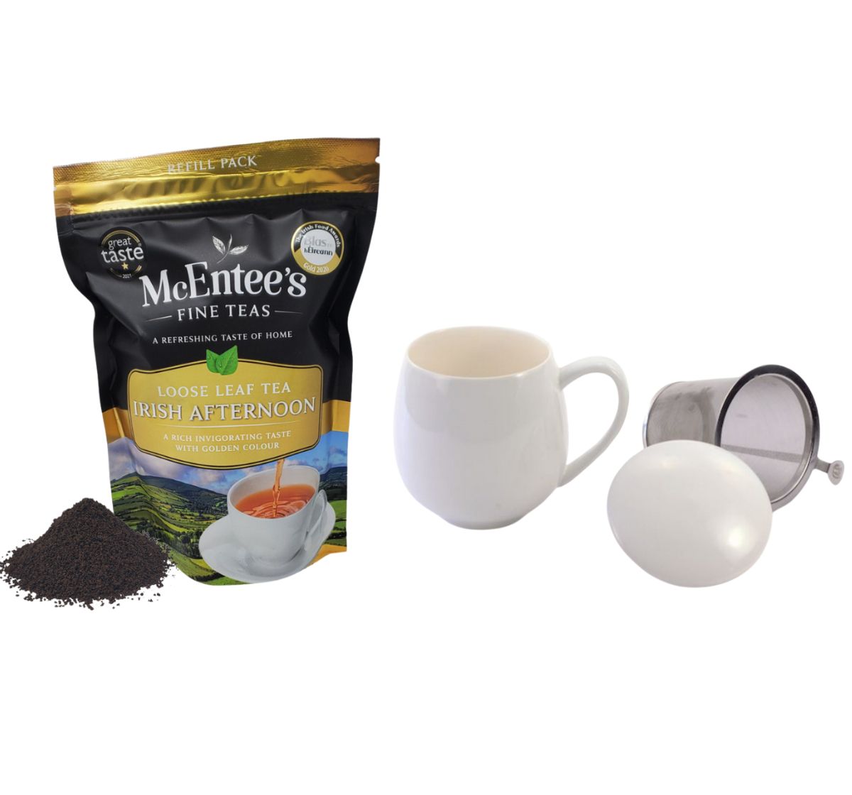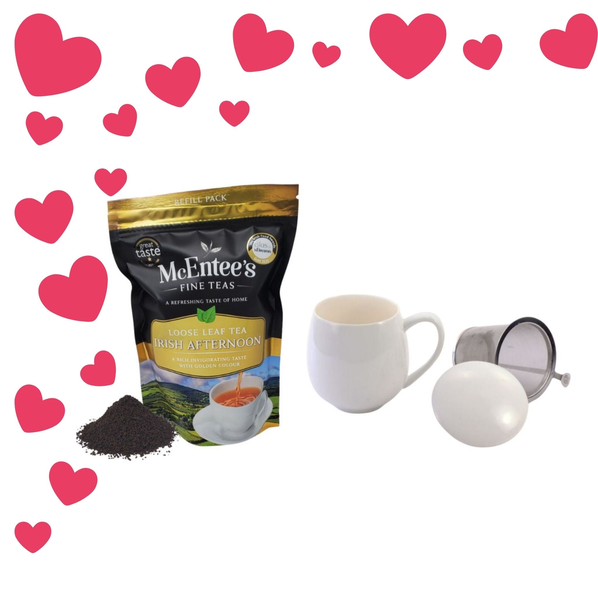 Treat the tea enthusiast in your life to a taste of McEntee's Irish Afternoon Blend, paired with a Strainer Mug featuring its own lid and a removable steel strainer for effortless brewing—a perfect setup for the ideal single cup. This thoughtful gift is ideal for both newcomers to loose tea and dedicated fans alike.